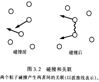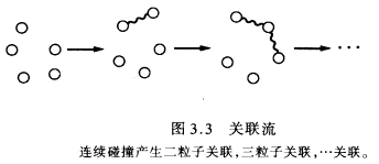 考虑依赖于两个变量x1和x2的概率分布ρ(x1,x2)。若x1和X2彼此无关,则我们有因式分解ρ(x1,x2)=ρ1(x1)ρ2(x2)。于是,概率ρ(x1,x2)是两个概率之积。反之,若ρ(x1,x2)不能分解因子,则意味着x1与x2关联。现在我们回到那杯水中的分子。水分子之间的碰撞有两个效应,一是使速度分布更对称,二是产生关联(见图3.2)。但两个关联的粒子还会与第三个粒子碰撞,于是二粒子关联转换为三粒子关联,如此等等(参见图3.3)。