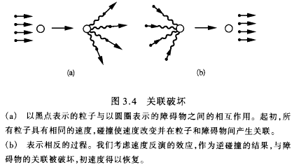 图3.3所示依时间为序的关联流的存在,已由计算机模拟得到证实。我们也可以再现通过时间反演(其中我们反演粒子的速度)产生如图3.4所示的过程。但我们只能对短期时间和有限数目的粒子实现这种反演关联流,此后,我们重新具有包括使系统趋于平衡的数目越来越大的粒子的关联流。