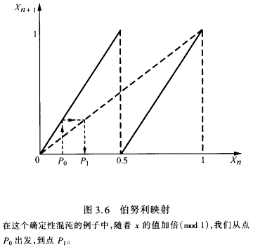 (mod 1)。这个映射如图3.6所示。运动方程再次成为确定性的,一旦我们已知xn,则xn+1的数值也就确定了。这里我们有一个确定性混沌的例子,之所以如此称呼,是因为如果我们用数值模拟来跟踪轨道,就会发现轨道是无常的。因为坐标x在每一步都乘以2,两条轨道之间的距离将为(2n)=exp(nln2),仍然是mod