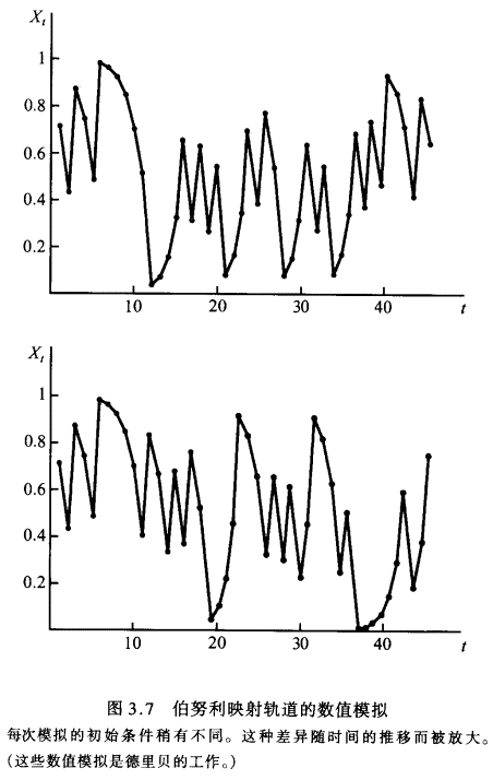1。用连续时间t,这可以写成exp(t λ),其中λ=ln2,λ称为李雅普诺夫指数。这表明,轨道指数地发散。这种发散就是确定性混沌的标志。若我们等待足够长的时间,则轨道最终将趋近0与1之间任意选择的任何点(参见图3.7)。这里,我们有一个导出随机性的动力学过程。过去,确定性宇宙中的这一表现流被许多大数学家反复研究过,诸如克罗内克(Leopold