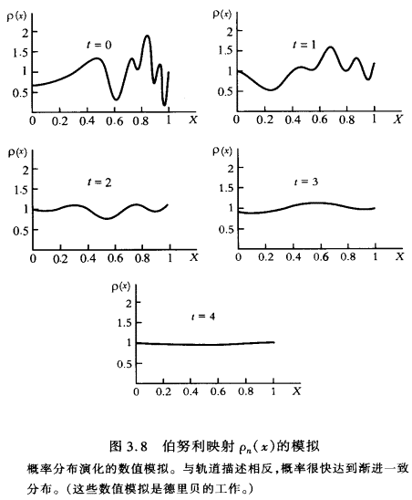 我们现在转向用佩龙-弗罗贝尼乌斯算符的统计描述上来。在图3.8中,我们看到算符U对分布函数的影响。轨道描述的差异是显著的,因为分布函数ρ(x)很快变为常量。因此,我们断言,用轨道描述的一方与用系综描述的另一方之间的基本差异必然存在。总之,轨道层次上的不稳定性导致统计描述层次上的稳定性。