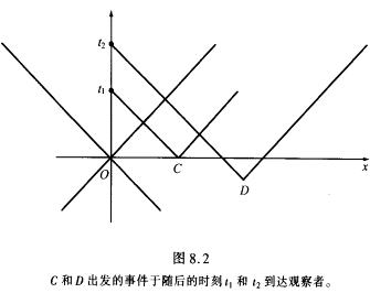 观察者位于这幅图中的O点,他的未来包含在“锥体”BOA中,他的过去包含在锥体A'OB'中,这些锥体由光速c所确定,锥体内速度小于c,锥体外速度大于c,从而不可能实现。在这幅图中,事件C与O同时,而事件D先于O。但这一结论纯属约定俗成,因为洛伦兹变换将旋转轴t、x,于是,D可能与O同时,C可能落后于O。洛伦兹变换修正了同时从C或D出发的事件以光速传递信号相联系,它们也将于后来的时刻t1和t2抵达。结果,O只能收集有限的数据,这与已由米斯拉(Baidyanath