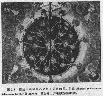 实际上,对于帕拉塞尔苏斯派学者来说,地球可被视为一个巨大的化学实验室。这种观点解释了火山、温泉和山泉的起源以及金属的生长。人们在解释火山时用了内火这样的旧概念,认为它是熔融物质通过地表裂缝的喷发物(图2.3)。山泉也以类似的方式得到解释。他们在此争辩说,地下水库里的水被中心火的热所蒸馏,当这种蒸汽抵达地表时,山体就像化学蒸馏器一样起作用,其结果就是被“蒸馏”出来的山泉。也有一些人对这种火的可能性表示反对,他们认为,地球内不存在这种大火所必需的空气。亨利·德·罗契斯(Henri