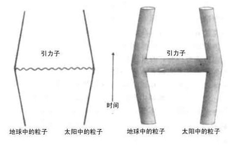 两根弦可以连接在一起,形成一根单独的弦。在开弦的情形下,只要将它们端点连在一起即可(图10.3);在闭弦的情形下,像是两条裤腿合并成一条裤子(图10.4)。类似地,一根单独的弦可以分成两根弦。在弦理论中,原先以为是粒子的东西,现在被描绘成在弦里传播的波动,如同振动着的风筝的弦上的波动。一个粒子从另一个粒子发射出来或者被吸收,对应于弦的分解和合并。例如,太阳作用到地球上的引力,在粒子理论中被描述成由太阳上的粒子发射出并被地球上的粒子所吸收的引力子(图10.5)。在弦理论中,这个过程相应于一个H形状的管(图10.6)(弦理论有点像管道工程)。H的两个垂直的边对应于太阳和地球上的粒子,而水平的横杠对应于在它们之间传递的引力子。