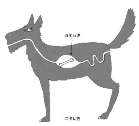人择原理可能提供一个答案。二维空间似乎不足以允许像我们这样复杂生命的发展。例如,如果二维动物吃东西时不能将之完全消化,则它必须将其残渣从吞下食物的同样通道吐出来;因为如果有一个穿通全身的通道,它就将这生物分割成两个分开的部分,我们的二维动物就解体了(图10.8)。类似的,在二维动物身上实现任何血液循环都是非常困难的。