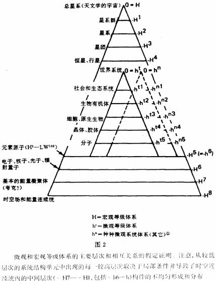 manifold)中的临界张力。因此,原子是自然宇宙等级体系中相对高层次的构件,而且它们在宇宙中是(或被认为是)无处不在的:既出现在相对稀疏的星际空间,也出现在所有种类的星体中。但是,原子也以其它形式出现:作为地球类型等级体系的基本砌块。(尽管也许有人会争辩说,粒子、夸克或时空簇可以起这种基本砌块的作用,对此我们总能回答,粒子、夸克或时空簇很容易被概念化为原子的下层系统或原子的初始成分。)在给定的特殊条件下(用温度、化学环境、密度、引力场和电场等定义),某些种类的原子经历共同的结构重组,最终成为分子和结晶体。然后,这些东西在一种更加严格限定的条件下结合成聚合物以及各种大分子(色括蛋白质在内)。后者构成(在各种进一步的限定条件下)细胞,细胞依次又形成多细胞的有机体,直至最后的社会系统和生态系统。尽管形成这种超级协调结构的力或推动都无法从研究组成它的下层系统的形态学中得到解释,但是,事实仍然是,存在着一个层次上的结构整体,在它后面是一个把一个层次较高的第二层次加在第一层次上面的结构。所以,进化的记录我们从原子带到了多原子的分子和晶体,并且一步一步地踏入某种行星范围的动态自我维持系统。而中枢点——也就是宇宙天文等级体系和地球等级体系的交汇点——是在原子层次上。虽然提出大量的使自然等级组织概念化的不同方法无疑是可能的,但是这个交汇点却是最可能被保存下来的。图2提供了这样一种概念化的方法,它是这种议论的图示,而不是一种完成了的理论产品。