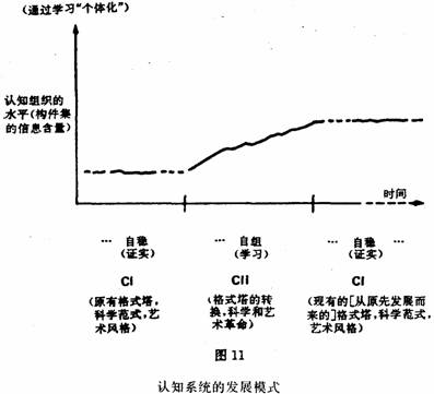 既然认知系统存在于环境的持久秩序中,所以知觉输入不大可能由于用另一个同样或同等复杂以及同样潜在可理解的模式来取代某一种模式而变化。而更有可能的是,知觉模式中的变化通常意味着在同一个组织环境中发现了新的东西或新的状况.而且,旧模式往往不会退出,而是与新模式一起继续存在。在这种情况下,新的建构集定能比原先的任何知觉模式在更广的范围内表示知觉模式的意义,而且往往因此具有更高的组织性。这不只是从理论上讲,实际情况就是如此,这是皮亚杰及其合作者的研究结果所表明的。皮亚杰告诉我们,人的认知结构是从婴儿的最初经验开始的连续创建的结果。全部结构的存在应归功于个人在一生中应变的创建。接着,皮亚杰断言,“从事实来看,人们必须明确地承认,一个创建总是构成一个从较简单到较复杂的结构的变迁,而且创建处于无限的回归中(根据现有知识)”。但是,结构的复杂化并不唯一地归因于环境中变异的持久的秩序的挑战,而是由人的心灵中的潜力的“同流”(homeorhetic)实现所引起的。精神的发展存在于一个有序的、多阶段的系列中,类似于器官的形成。由于经验的知识模式不仅变化,而且扩充,不仅分比,而且强化,所以格式塔、逻辑结构以及许多其它的人类认知“图式”的同化描绘了不断发展中认知系统的自组。精神发展中的可观察到的倾向清楚地趋向于获得具有较多信息量——因此(通过类推)具有更多的负熵——的结构。这出现在认知结构把它们环境中的许多系统因素摹写到日益复杂和日益组织化的具体的和抽象的建构集中的时候。