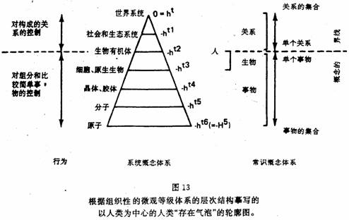 人的感觉器官和思维形式朝着严格的功能的目的进化:通过传递信息(从同他本身有关的那部分环境里获得的)并赋予这些信息以操作上的实际意义,人类自己能够更好地生存下去。因此,由感觉传递的和以实际的常识性思维方式进行编码的人类经验并不一定是客观经验知识的可靠工具。事实上,生物和文化因素结合形成了一种个人的生存“气泡”(existential“bubble”)。这个“气泡”使他能非常好地生活在他周围世界中;不过,当他把它当作客观知识的向导时就可能被引入歧途。“气泡”还包括事物和相互关系的概念,一般说来,具体性质和实在被限定在前者(即事物)的范围内。通过把事物类型限制在人类及亚人类实体的层次上,就使得人类能够有效地操纵它们,具体做法是把最复杂的事物看成是与他同等级人,把所有较简单的事物看成复杂事物的组分,或者看成环境背景中的较简单的实体。然而,在高于人类层次上,单纯的事物将不复存在,取而代之的是它们的相互关系。由干具体的人的共同努力,它们被组织起来和概念化了,这样一来,人类就得到了一张操纵超级的(社会的和生态的)结构的许可证。最接近于人类层次的事物最容易识别,而在比较小的尺度上的简单事物则逐渐消失在认知意识的外围中了。等级体系中较小的实体仅仅是以聚会体的形式被人们认识的,这种聚合体又包括数目相对众多的更小的组分(如晶体、分子和原子)。同样,恰好高于个人层次的关系同样是那些最明显地显现出来的关系:这就是人际关系。在这些关系之上是更为复杂和广泛并且越来越模糊的关系领域,它们沿着更为宏大的社会和生态系统方向扩展,最终到达世界系统。人类主体本身是个重大的分界线或转折点,这恰恰就是他所认识的。这是“人”的层次。从这个层次向下是被控制的“事物”,而从这个层次向上则是被安排的“关系”。因此在常识意义上人类的存在“气泡”是非常有效的:它允许控制-行为在微观等级体系中向两个方向延伸(图13)。然而,对客观地摹写周围世界来说,这个气泡的正确性却值得考虑。