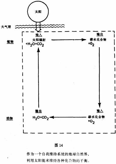 证据(2)包括各种循环过程(像碳和氮的循环),这种循环把土壤和空气中原子的和分子的结合物纳入在植物体和动物体中起作用的生物化学加工过程;而且,在这些循环中,某些形式的能量能够被生物圈内所有系统利用。西尔斯认为,自然界整体可以被认为是“自我修复的,建构的过程”,它代表了“近似于开放的稳态”的某种类型的平衡状态。(图14)