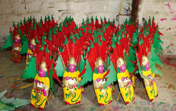 3、上彩。上彩可由妇女、儿童动笔。但面部、盔甲、衣饰等重要部分,一定要专业人士动手。精品的要用鸡蛋清作敷料,才会光艳夺目。
