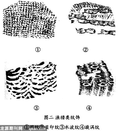 渔猎活动是新石器时代原始人类最重要的生产活动之一。昙石山文化所处的沿江沿海的地理环境对昙石山文化原始先民的影响尤为直接。他们不仅从江河与大海中获取赖以生存的食物,而且水上航行也成为当时人们生活的重要组成部分。因此,捕捞业和水上航行也在陶器纹饰中有所体现。例如反映捕捞业的网纹和贝印纹(图二:①、②)。其中贝印纹(或称贝齿纹,是用贝壳压印的方式在陶器上制作的纹饰)是昙石山文化极具地方特色的纹饰。在昙石山遗址发现有大量的贝壳堆积,证明了水生贝类是当时人们的主要食物来源之一,而贝印纹的发现也说明食用后的贝壳还成为昙石山文化先民加工陶器纹饰的工具之一。由于经常与江、河、海打交道,水的表象也得到较为充分的观察了解,典型如水波纹和漩涡纹(图二:③、④)以及波浪纹等。这也从一个侧面反映了水上航行是昙石山文化中的重要组成部分。考古研究表明,昙石山文化的航海水平在当时是比较发达的,其传播范围不仅到达台湾和东南亚,甚至今天广泛分布在南太平洋群岛上的南岛语族也与昙石山文化存在着千丝万缕的联系。