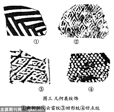 特别值得注意的是几何类纹饰。几何纹是一种更为进步的表现手法,它摆脱了对于实物的直接的模仿,而是将其抽象化。例如彩陶纹饰中发现的曲折纹就很可能是对鱼骨的模仿(图三:①)。不仅如此,几何纹还能反映原始先民意识形态的状态,即它包含有原始宗教的因素。昙石山文化陶器中的菱形纹、凹点纹、云雷纹和回形纹(图三:②、③、④)就很有可能反映了当时的图腾崇拜。“闽,东南越,蛇种,从虫门声”。[2]蛇图腾崇拜在福建原始部落中十分普遍,有学者据此推测上述几何纹饰是对蛇身上的花纹的模仿,[3]笔者认为凹点纹、菱形纹很可能是模仿蛇的皮肤或花纹,云雷纹和回型纹则可能是蛇的形体的抽象表现。但也有学者认为,由于渔猎在当时生产活动中的重要地位,这些纹饰应当是对鱼类身上的鳞、骨等部位的模仿。例如菱形纹是对鱼鳞的模仿。[4]对此,笔者认为,首先,就直观而言,鱼鳞在形状上更接近扇形而并非菱形,制作扇形的纹饰并不比菱形的来得复杂;其次,如果是模仿鱼骨,采用压印的方法制作更为方便,那么类似的压印纹饰也应该有所发现,但目前尚无发现此类纹饰。最后需要补充说明的是,纵观昙石山文化的陶器纹饰,我们还可以从中发现其原始宗教的发展脉络。一般认为,只有当具备了自然崇拜、动植物崇拜和鬼魂崇拜、祖先崇拜后,图腾崇拜才有可能产生。[5]在昙石山文化陶器纹饰中,我们可以找到反映动植物崇拜的植物纹饰、反映自然崇拜的水波纹饰以及有图腾崇拜含义的几何类纹饰。这也从另一个方面印证了昙石山文化是一个持续发展的新石器时代文化。