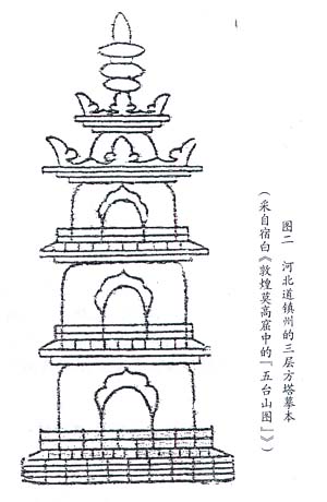 《五台山图》中镇州城衙署之东南方近城角处绘有一座三层方塔。塔最下部为四行砖砌基座,方形塔身建于基座上,各层上端均收刹,每层塔身底部环以朱栏,上部叠涩出檐,正面辟门。三层塔身顶部檐边饰山花蕉叶,中为覆钵,覆钵之上叠涩出檐,周边施山花蕉叶,正中起刹,上施相轮三重,顶冠宝珠(图二)。