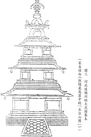 对于唐大悲寺菩萨的形象,人们大概能够想像得出,但对覆护佛像的唐大悲寺大悲阁的样子却难以得知。可喜的是,《五台山图》“河北道镇州”图中为我们勾勒出了位于城西的大悲阁的外观。此阁为面阔三间的木结构三重楼阁,建于五层砖砌的台基上,台基正中铺墁龟背纹坡道。每层均为三开间,明间辟门,次间设窗,二、三层施平座栏杆。三层出檐之上中置覆钵,其上叠涩出檐,檐边为山花蕉叶,正中覆钵上立刹,相轮、宝盖、宝珠以刹杆贯穿,顶端完全同塔刹结构。此种式样的建筑应该是印度覆钵式塔与我国高层楼阁相结合的产物(图三)。其旁榜题为“镇州城西大悲阁”。