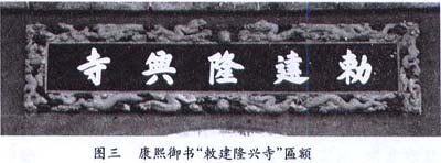 三月,康熙帝钦赐《御制隆兴寺碑》。御书匾额19方:敕建隆兴寺(图三)、天王殿、大觉六师之殿、慈云普荫、摩尼殿、广长妙谛、妙庄严域、通津宝筏、戒坛、慈氏阁、转轮藏、佛香阁、御书楼、集庆阁、伽蓝殿、祖师殿、弥陀殿、药师殿、静业堂。