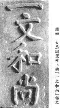 大悲阁是隆兴寺的主体建筑,北宋初年奉皇帝之命而建,因阁内22米高的铜铸千手观音位居全国之最,故倍受历代封建皇室的重视,金、元、明、清曾多次奉敕重修。清朝末期至民国初年,由于受当时政治经济条件的限制而无力进行整修,致使大悲阁顶部坍塌,铜像饱受风雨侵蚀。民国二十年(1931年)纯三和尚来隆兴寺作住持后,目睹此残状,遂誓愿复兴,但因工程浩大力所不及,便于1933年采取权宜之计,在铜像下石须弥座上砌筑了一个30多米高的佛龛以保护佛像。民国三十年(1941年),在当时的河北省长吴赞周、华北政务委员会委员长王揖唐的发起下,决定拆去佛龛,重修大悲阁。经过三年募集筹资,北京刘世铭居士代为设计绘图,北京阜民公司施工,工程始于1943年正月,落成于1944年3月。此次重修因财力不足,故拆去了两侧耳阁以利用旧料,结果不仅大悲阁的面积缩小,两耳阁也被夷为平地。关于这次重修,除大悲阁月台西侧有民国三十三年立的《重修隆兴寺碑》外,尚有住持纯三和尚写的《重建大悲阁因缘纪略》折页。由于1944年的重修缺乏科学性而未能经得住时间的考验,1992年国家文物局派专家现场查勘后,决定重修大悲阁并恢复两耳阁。1997年8月24日举行落架仪式,1999年9月工程告竣。在1997年8月9日先期拆落大悲阁抱厦时,原本显露的带铭文望砖更清晰地展现在人们面前,其数量达近百块,大多为长方形灰砖。砖长35.5~41厘米,宽22~26厘米,厚3.8~5厘米。铭文分阳文和阴文两种,分别为“一文和尚”(图四)、“孤舟重修”、“梦堂重修”、“大悲菩萨”等字样。另外还有尺寸为38×23×4厘米、阴刻“民国壬戌重修,纯三和尚”字样的水泥砖。“一文”乃隆兴寺宋代高僧,“孤舟”、“梦堂”为该寺明代高僧。