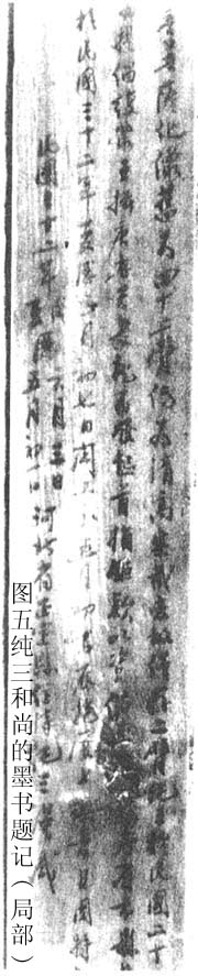 9月18日,在抱厦明间脊檩与随梁枋之间发现了一块长153厘米、宽7.75厘米、厚0.5厘米的墨书题记木板。木板正背两面均有文字。正面为民国三十二年五月初一大悲阁抱厦上梁时寺院住持纯三写的《重修大悲阁始末》(图五),计4行,全文如下:“正定大佛寺古名龙藏寺,创于隋开皇六年,今已一千三百五十七年。大佛铜像及阁建于宋开宝四年,迄今亦九百七十二年。大佛原为观音菩萨化像,旧为四十二臂,传为清高宗截去,故仅存二臂。纯三于民国二十年住持是寺,目睹大佛暴露,阁殿倒塌,实觉心伤,奈修复无力,徒唤奈何。虽经数度奔走,只以因缘未熟,故而终止。后于民国廿二年经程守初县长发起,募建小龛,暂避风雨。复于民国卅年蒙吴赞周省长代为提倡,复蒙王揖唐委员长亲为发起,首捐巨款以资倡导,以致各省、市、县长官踊跃输将,并代广为劝募。乃于三十一年先修复天王殿,□大悲阁因欲保存古建筑,且因工程浩大,颇费计划。幸遇刘世铭工程师代为绘图、设计、监工等,纯为义务,志在完成佛事,至为可感。乃于民国三十二年夏历正月初七日开工,至五月初一日辰抱厦上梁吉日。因特记其始末,以待后之有志者良以成住坏空,乃循环之定□。因缘虽熟,亦待有志者之努力。既因往昔引生,今后犹期,今后远胜于前。敬愿以此功德回向世界,早现和平,一切众生,同归安养。民国三十二年国历六月三日、夏历五月初一日,河北省正定县住持纯三谨识。”背面为上梁时间,寺院僧官名号及建筑师、承造者、工师的姓名:“中华民国三十二年六月三日岁次癸未年夏历五月初一日大悲阁上梁吉日。隆兴寺副司笑然、监院昙瑞、住持纯三、知客净春、悦众清林共同募修,建筑师承造者刘世铭、程子容、刘礼华,工师种志化、杨凤起、吴桂麟、孙玉盛、种永增。”