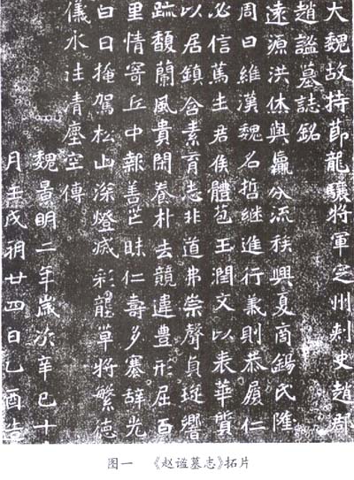 《赵谧墓志》(图一)[1]出土于河北赵县,原石未见,惟有拓片而已。拓片作长方形,纵45厘米,横35厘米,而不像常见墓志那样作正方形。形制之外,其内容也比较特殊,通篇12行,满行15字,首2行为志题,末2行为年月,中间8行为铭,铭前却没有序文。其文曰: