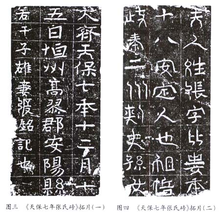 河南安阳郊区近年出土两块北齐天保七年(556年)墓砖,俱黄土烧制而成,长约35厘米,宽16.5厘米,厚4~5 厘米。二砖均刻三行界栏,其一满行10字,铭曰: