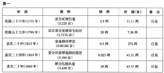 从表中可以看出,庄基地远较耕地价格高。如可比性较强的乾隆年间两张地契,乾隆三十六年卖契中,0.225亩庄基地卖价为2.5 两白银,每亩地价约为11.11两;乾隆五十九年卖契中,2.7176亩土地卖价为20两白银,每亩地价约为7.36两白银,比庄基地低了约1/3。原因是庄基地一般地处村中央或靠近村中央,适宜盖房居住,生活方便,且有四邻,有一定的安全性,故地价较高。同为庄基地,嘉庆二十四年、道光二十年两张地契的地价都高达每亩40多两白银,几近乾隆三十六年地契的4倍,主要原因应是庄基地上有房屋,只因使用格式固定的官制契纸,受其所限,契文中无法标示出来,不然不会有如此高的地价。当时饶阳所属的深州,“土薄而人寡。自唐以来,下于他州”,康熙时,饶阳“定县为中,治积谷一万石”[18]。在这土地瘠薄的地方,上好的熟地价格肯定不菲,更不用说村中庄基地的价格了。像李氏家族的李振彩,在乾隆五十九年(1794年)到道光二十年(1840年)长达40余年中,花去近50两白银先后买进大小不等的三块庄基地与二亩多耕地,应该是一个勤劳持家、踏实能干的自耕农民。