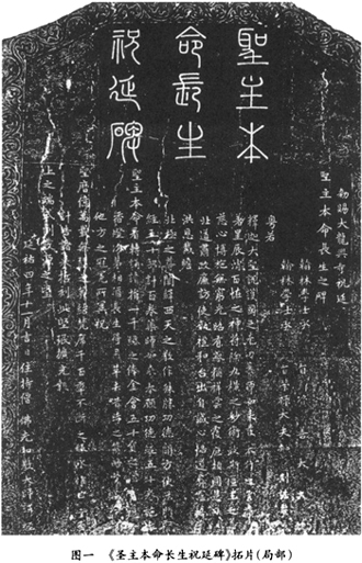 此碑现立于隆兴寺转轮藏后的北侧,外砌一碑楼,正面镶玻璃。碑为青石质,首身一石,高1.53米,宽0.80米,厚0.22米,立于长方形座上。首作笏形,碑额阴刻篆书“圣主本命长生祝延碑”3行9字,额两侧线刻云龙纹。碑身以卷草纹作边饰,碑文阴刻楷书19行,满行34字,共396字。碑下半截剥蚀较严重,但尚可识读(图一)。