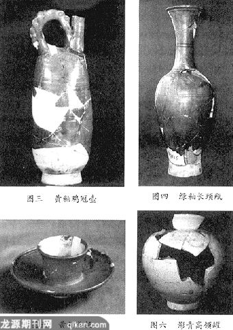 绿釉长颈瓶 2件,仅复原1件。喇叭形口,细长颈,溜肩,敛腹,圈足外展。颈中部饰弦纹两道,腹亦饰弦纹四道。器体施绿釉不及底,底露粉红色砂胎,胎上施白色化妆土。口沿处有三个支钉痕。口径9厘米,底径8.2厘米,高38厘米(图二,7;图四)。