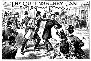 ②菲力普·豪尔(Philip Hoare)在《王尔德的最后讲台》(Wilde's Last Stand)中写道,在第一次世界大战的最后几年中,一个名叫比林(Billing)的英国法西斯首领谎称,德国人收集了英国最高层的四万七千名同性恋者的名单,随时可对他们进行敲诈。豪尔认为,如果英国在一战中打了败仗,比林很可能成为英国的希特勒。"[这一虚构阴谋的]中心是仍有四万七千人受着对王尔德的狂热崇拜的影响。"战后,极右翼分裂成许多派别。比林受到诽谤的指控。由于陪审团的同情,他被判无罪。这次不成功的起诉的诉方首席律师是特拉维斯(汉弗里斯(Travers Humphreys),他自称二十五年前是王尔德控告昆士伯里勋爵诽谤时的控方律师,又是之后王尔德受到严重有伤风化罪的指控时的辩护律师。后来"汉弗里斯……又为国会废止1885年反同性恋的拉布歇尔修正案(Labouchère Amendment)进行了游说。这一修正案被许多人视作'敲诈者的权利法案'。"王尔德所受的折磨,戏剧性地表现了人们对同性恋行为会危及社会的恐惧。后来他的例子又使人相信,针对这种行为的法律本身,对社会是一个威胁。)
