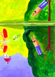 一天清晨天刚破晓他就独自上路了,把小船划到湖中心,那是大湖最深的地方。用来当鱼饵的?是一只死老鼠,在玉米穗仓库里找到的。他把老鼠钓上鱼钓,抛出去。足足用了五分钟才到湖底,然后他慢慢地把它往上提。很快他就受到了攻击。这股攻击抓住了老鼠,抓住了鱼钓,抓住了一切。于是他又作尝试。这次换了一个更大的鱼钓,更结实的鱼线,更可观的死老鼠,整个阵容都换了。现在湖水开始翻滚,冒泡,起浪,就好像湖的精灵升了上来。爱德华只是钓着鱼,只是钓。尽管那也许是个坏主意,现在眼看着湖变得越来越不像湖。这让他有点胆战心惊。也许他应该收起他的小老鼠掉头回家。对。只是,在他收线时他才发觉线并没有像他动的那样动。向前移动。他收得越快,他动得也越快。他知道该怎么办,很简单:放开钓竿。放开它!扔掉它,跟它吻别。谁晓得线的另一头是什么在拉着他?可是他却偏偏丢不掉。他做不到。他的手好像成了钓竿的一部分。开始他决定用第二个绝招,停止收线,可是这第二个绝招也不管用:他继续往前移动,爱德华不停地向前移动,移动得很快,比先前更快了。这可不是闹着玩的,不是吗?他正在被一样东西——一样活的东西拖着跑——一条鲶鱼。像一条海豚,他看着它蹿出水面,画出一道拱形的弧线,一抹灿烂的阳光照在它身上,美丽、诡异、惊心动魄——有六七英尺长?——现在随着它潜入水中,把爱德华也带走了,猛地将他拉离小船,拖着他一路往下,深入到大湖的水底墓场。在那儿,他看到了房屋,农田,道路,阿什兰那被洪水淹没的一个小小的角落。他也看到了人:有荷马·基特里奇和他妻子玛拉。有弗恩·塔尔波特和卡罗尔·史密斯。荷马提着满满一桶饲料去喂他的那些马,卡罗尔和玛丽聊着谷物。弗恩开着拖拉机。在深不可测的暗绿的湖水里,他们一举一动都像是慢动作,他们说话的时候,唇边就会冒出小水泡,不断地升到水面上。在大鲶鱼带着爱德华疾行而过时,荷马微笑着向他挥手致意——爱德华认识荷马——但是还没有挥完手,他们就又消失了,一条鱼和一个人,忽然腾身就出了水面,爱德华被抛到了河滩上,钓竿早已不知去向。