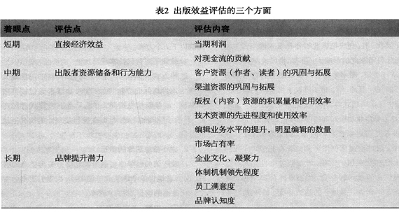 在实际工作中,出版者的行为是通过绩效评估来引导的。大市场观要求我们具备更为全面、科学的出版效益评估体系。在这一体系内,直接经济效益只是一个方面,但不是全部。具体说来,出版效益应包括直接经济效益、出版者资源储备和行为能力,以及品牌提升潜力三个方面(表2)。