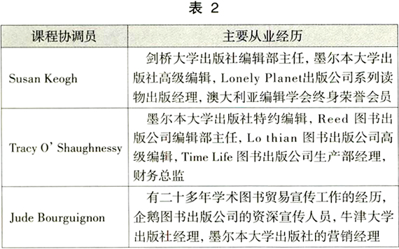 教育的课程项目必须有行业协会参与,并且得到行业协会的认可。许多大学的出版教育的课程项目都要得到澳大利亚出版工作者协会的认证。其次,课程设置是由“课程协调员”(course coordinators)负责的。他们往往有丰富的产业实践经验,熟悉教育,更熟悉产业发展的动态,被称为行走在学界与业界的双栖型人才。课程设置每年都进行更新与调整,以与产业的发展相衔接。墨尔本皇家理工大学是一所以培养应用型人才著称的大学,其编辑与出版项目课程协调员的主要从业经历(见表2),充分体现了澳大利亚高等出版教育“一只脚在学界,一只脚在业界”的特点: