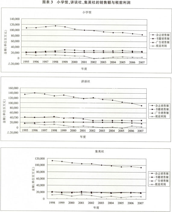 在目前出版单位的业绩中,足见业界所面临的问题之严峻。图表3就显示日本前三大出版社——小学馆、讲谈社、集英社的书、刊、广告销售额及税前利润,这三家出版社在销售总额中杂志销售所占的比重极大。直接关系到销售利益。