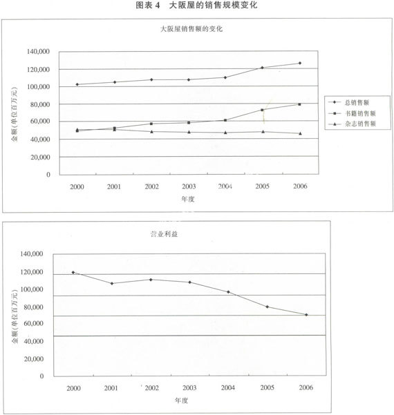 由于对杂志类的依赖度过高,那么一旦杂志销售不振,必然会对出版流通单位的经营造成很大打击。以在主要流通公司中销售排名第三的大阪屋为例。它拥有1千~2千平方米的店铺,与图书馆型书店“淳久堂”(JUNKUDO)和“阪急”(HANKYU)交易频繁,2002年开始向日益显著发展的日本亚马逊公司供应图书,在整个出版市场低迷不振的情况下销售额持续稳步增长,但销售利润却逐年减少。(见图表4)