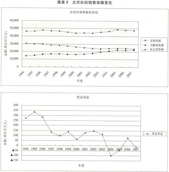 出版流通销售排名第五的太洋社情况更加严重。最近,太洋社虽然与大型书店的交易活跃,书籍类的销售有所增加,但杂志、漫画类所占的比重较大,销售总额有所增加,利润却日益减少,陷入赤字危机。(见图表5)