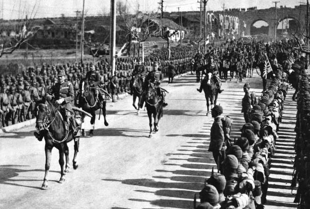 1937年12月13日南京沦陷后,日军举行入城式,最前面骑马者为松井石根。