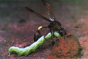 | 细细的腰,玲珑的身材,腹部分成两节,下面大,上面小,中间好像是用一根细线连起来,黑色的肚皮上面围着一丝红色的腰带:这就是赤条蜂。 赤条蜂的巢穴是建筑在疏松的极容易钻通的泥土里的。小路的两旁,太阳照耀着的泥滩上,那些地方的草长得很稀疏,都是黄蜂最理想的住所。在春季,四月初的时候,我们总可以在这样的地方找到它们。 赤条蜂通常在泥土里筑一个垂直的洞,好像一口井,口径只有鹅毛管那么粗,约有二寸深,洞底是一个孤立的小房间,专为产卵用的。黄蜂建巢的时候,总是静静地、慢慢地工作着,丝毫没有什么热烈或兴奋的样子。像别的蜂一样,它用前足作耙,用嘴巴作挖掘的工具。有时候我们就可以听到,从洞底发出一声尖利、刺耳的摩擦声,这是因为它遇到了一颗极不容易搬去的沙粒引起翅膀和全身剧烈振动的缘故。每隔短短的十几分钟,我们就可以看到赤条蜂在洞口出现,嘴里衔着一些垃圾或是一颗沙粒。它总把这种垃圾丢到几寸以外的地方,这样可以保持自己的居所和周围环境的整洁干净。 有几颗沙粒会被区别对待。赤条蜂们会对它们进行特殊的处理,使它们免遭被远远抛出去的命运。这些沙粒被赤条蜂们堆在洞的附近,将来会另有重大的用途。当赤条蜂把洞完全挖好了,它就在这小沙滩上察看有没有适合它需要的沙粒。如果没有,它就到附近去找,直到找到为止。它需要的是一粒扁平的,比它的洞口稍大一些的沙粒,它可以把这个沙粒盖在洞口,做成一扇门。第二天它从外面猎取一条毛毛虫回来,就不慌不忙地把门打开,把猎物拖进去。这门看起来和其它沙粒完全一样,谁也不会想到它底下会藏着食物,藏着一只赤条蜂的家,只有它自己才能辨别出它的家。它打开门,不紧不但地把猎物放到洞底后,就开始在上面产卵,然后再用它以前藏在附近的沙粒把洞口堵住。这听起来似乎有点像《阿里巴巴与四十大盗》中“芝麻开门”的故事。 赤条蜂所猎取的食物是一种灰蛾的幼虫。这种虫大部分都是生活在地底下的,赤条蜂又是怎么把它捉到的呢?让我们来看看吧。有一天当我散步回来的时候,正好看到一只赤条蜂在一丛百里香底下忙碌着。我立刻在它附近的地上躺下。我的出现并没有把它吓走。它先飞到我的衣袖上停了一会儿,断定我不会伤害它之后,又飞回到百里香丛中去了。从过去的经验我知道这意味着什么:它忙得很,没有时间来考虑我这个不速之客。 赤条蜂把百里香根部的泥土挖去,又把周围的小草拔掉,然后把头钻进它挖松的土块里。它匆匆忙忙地从这里飞到那里,向每一条裂缝里张望。而不是在为自己筑巢,而是在寻找地底下的食物,活像一只猎狗在寻找洞里的野兔一般。 灰蛾的幼虫觉察到了上面的动静,决定离开自己的巢,爬到地面上来看看到底发生了什么事。这一念之差就决定了它的命运。那赤条蜂是早已准备就绪,就等着它的出现了。果然,灰蛾的幼虫一露出地面,赤条蜂就冲出去一把将它抓住了,然后伏在它的背上,像一个熟练的外科医生一样,不慌不忙地用刺把毛虫的每一节都刺一下。从前到后一节一节地往下刺,一点儿也不遗漏。它那熟练的动作,让人想起游刃有余的屠夫。 赤条蜂的技巧令科学家们都自愧不如。它可以靠观察去推断人类所从不知道的事情。它很熟悉它的俘虏的神经系统,它知道往哪些神经中枢上扎刺,可以使它的俘虏神经麻木而不致于死亡。它从哪里学到的这种知识呢?我们人类有学校,有老师,有各种书籍,我们通过这些逐渐地积累知识懂得大自然的许多奥妙。可是赤条蜂是怎么知道这些复杂的知识的呢?而且不用练习就掌握了那么熟练的技术,难道是在它们出生前,冥冥之中就有神灵赋予它们这种本领了吗?大自然多神奇啊,当我们孜孜不倦地探索它的秘密时,它早就有条不紊地安排好了一切! 我还要告诉你另一幕赤条蜂和毛毛虫大战的故事,这也是我亲眼看见的。那是在五月里,我看着赤条蜂在一条光洁的路旁为它的巢作最后一步的清除工作。它的几码外的地方已经麻醉好了一条毛毛虫,当它清除好那条街道并且把洞开得足够大后,它就出去搬毛毛虫了。 它很容易地找到了那条毛毛虫,那条毛毛虫就躺在地上。可是糟糕的是,蚂蚁也正在猎取那条毛毛虫。赤条蜂不愿意和蚂蚁分享这条毛毛虫,可是要把蚂蚁赶掉,也不是一件容易的事,再三考虑之后,它认为自己的能力实在有限,还是不要作无谓的牺牲吧。于是它决定放弃这条毛毛虫,再到别处去寻找食物。 它在离巢大约十尺以内的地方,一步一步慢慢地走着,察看着泥土,不时地用它那弯着的触须,在地面上挥动,像一名执着的士兵用探雷针寻找着地雷。在烈日的下面,我观察了它整整三个钟头!要找到一条毛毛虫是多么困难啊,尤其是在急需的时候。 即使是对人,这也是一件困难的工作。我一心要帮助它,替它找到一条毛毛虫,因为我想看它怎样麻痹毛毛虫。 于是我就想起我的老朋友法维,他是我的园丁,正在那里照料花园,于是我把他招呼过来。 “快来快来!我想要几条灰色毛毛虫!”我把事情飞快地向他解释了一下。他明白了,马上去找虫子。他挖掘着莴苣的根,耙着草莓里的泥,察看着鸢尾草丛的边缘。我非常信任他,他的眼力和聪明,因为那么多年以来,大家都认为他是一个出色的园丁。 过了好久,也没见法维拿毛毛虫过来。 “喂,法维,毛毛虫呢?” “先生,