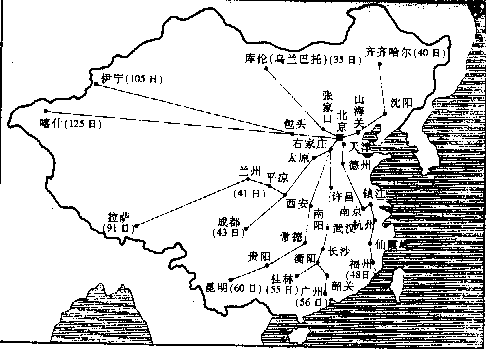 拨过手表,于是我们到了群山之母的帕米尔高原,它是中国最西的边界,塔吉克、阿富汗、巴基斯坦三个国家环绕在他的另一面,成为中国西陲尽头的三大邻邦。 空中鸟瞰之后,让我们走下太空船,跨上马背,对这个巨大舞台,再作一次了解。 下面表格,显示出十八世纪之前,我们如果骑马对若干重要城市作一次访问的话所需的时日。那是十八世纪清王朝,从当时的首都北京到各地驿站的官定行程(最后一项从包头到喀什,是普通的商旅行程),它说明中国人对这个庞大国度的长久凝结力量的韧度。那虽然是十八世纪清政府时的规定,但这种情况可以追溯到纪元前三世纪跟匈奴人作战时代,在交通方面,二千年间只有稍稍的改进,很少突破性的变化。