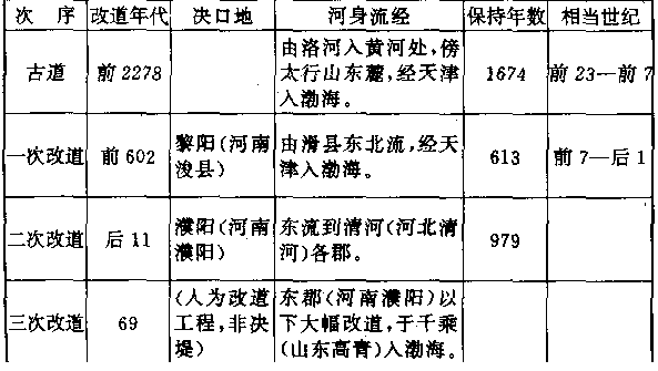 “限期”是驿站传递公文书时以马匹普通速度作为标准,也就是以骑马的正常速度作为标准。“加急”多半用于军事行动,凡加急的驿站递送,本身的动作就是一场惊心动魄的电影镜头:驿马以四足高地的速度狂奔,铃声可传到一公里以外,下一驿站听到后,日夜都在待命的驿率,立即上马飞驰。当后马追及前马,两马相并时,马足不停,即在马上将公文书交递。驿马往往因狂奔过度而倒毙,如果五年内幸运不死的,它就成为宝马退休,由政府饲养,不再作工,以酬庸它对国家的贡献。 这种速度当然不适合普通的商人和旅客,但它正是庞大国土的动人标帜。东西两洋历史上只有少数帝国,如波斯帝国,亚历山大帝国,罗马帝国,阿拉伯帝国和稍后的蒙古帝国,帖木儿帝国,可以跟中国这种马行一百零五日的情况相比。但他们都已被时间抹灭,只中国迄今巍峨独存。 注意两地之间的距离,里数相等,并不是说行程、日数也会相等。像山径崎岖之类的障碍,能使速度锐减。表格上的日数,是以马匹为主。如果我们从马背上跳下来,改为步行,日数恐怕要增加三倍到四倍。 在对中国全部疆域有一个概括的印象之后,让我们分门别类地介绍他各方面的形态,这些形态构成舞台的全部地貌,是中国历史发展的重要基础。 首先介绍中国历史上几条重要的河流。 黑龙江 全长四千三百五十公里,但在中国境内和流经中国跟俄国边境的只有三千四百二十公里。它是中国最北的水道,流域面积达一百六十二万平方公里(包括国境以外面积),一年中有六个月的结冰期,河面像钢铁一样,重型坦克车可以任意在上面驰骋。不过在古代中国史上却没有特别重要的地位,直到十四世纪才跟中国接触,十七世纪才随着满洲人建立的清王朝的入主中国,像嫁妆一样并入中国版图。它的最大支流松花江,全长一千九百二十七公里,十世纪时称混同江,为契丹人和契丹人建立的辽帝国的主要渔猎河道,名震一时。 黄河 全长五千四百六十四公里,流域面积七十五万平方公里,是中国历史上最重要的河流。古中国文明就在这个流域上发生和成长,大部分历史也都在这个流域上演出。这条中国第二大河发源于青海省的巴颜喀拉山,成一个“几”字形状,向东注入渤海。凡是河流,几乎都具备若干利益,如航行、渔产、灌溉。只有黄河,对它两岸的居民,帮助很少而伤害很大。它在历史上扮演的角色像一条喜怒无常的巨龙,翻滚奔腾,专门制造可怕的灾难。从纪元前二十三世纪到纪元后二十世纪初叶,四千余年间,便有过一千五百余次的小决口和下表所列的七次大决口及八次大改道(包括一次人为改道)。