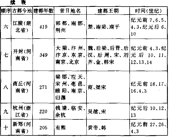 中国最早、最古老的国都,是居第十位的新郑,筑城时间在纪元前二十七世纪,仅比西方世界萨尔贡帝国的阿卡德城稍晚一百年。居第四位的夏县,筑城时间在纪元前二十三世纪。居第八位的商丘,筑城时间在纪元前十八世纪。居第六位的江陵,筑城时间在纪元前七世纪。但这一系列的在古中国煊赫一时的权力中心,现在虽然仍有名称相同的城市存在,却很难再找到昔日光荣的残迹。 建都之久居第一位的西安。它所在位置的渭河流域和关中地区,是古中国的精华所在。八、九世纪时,受到吐蕃王国和叛军的攻击,灌溉系统破坏,人民逃散,不能再维持一个经济单元,才丧失继续作为国都的资格。但二十世纪使它复兴,成为重工业中心之一。它拥有最多的古迹,从纪元前二世纪西汉王朝所建立的长乐宫遗迹,到绝世美女杨玉环沐浴过的华清池温泉,无一不使人兴起怀古的幽情。 居第二位的洛阳亦然,纪元前十一世纪,周王朝在此兴筑两个相距二十公里的双子城:西城称为王城,东城称为成周——成周也称洛邑、洛阳,不久就成为全国政治文化的中心,以美女和牡丹闻名于世。但它恰位于华北大平原的西方边缘,跟关中地区相接,成为内战中必争之地,再三再四地被大火焚毁,以致十世纪之后,终于没落为一个窄狭而又粗陋的小城,直到二十世纪末,才逐渐恢复它过去的光辉。它拥有跟西安同样多的古迹,洛阳城跟黄河之间的邙山,就隐藏着无数历史故事。 居第三位的北京,是中国古城中的钻石。自十三世纪起,一直都是中国大一统时代中央政府所在地。北京语在二十世纪初被定为标准中国语,北京居民的谦逊态度和文化素质的深厚,为全国所称道。它所拥有的古迹都是近代的,没有西安、洛阳那么古老,因之保存的也比较完整。北京在中国近代史上显示出它重要性的原因有二:一是它的位置,不但可照顾多灾多难的北疆,还有充分的热力,辐射到遥远的东北地区黑龙江流域和西北地区的新疆。在来自北方的侵略威胁消失前,国都设在北京,是一种倔强的面对挑战的态度。二是国民的心理状态,北京一连数百年都是全国政治文化中心,人们有一种向往的向心力,增加全国团结和统一的力量。 居第五位的南京,于三世纪东汉王朝末期筑成,被形容为具有龙蟠虎踞的形势。但它充当国都的时代,几乎全是分裂时代。而且每一个王朝,都在短短的期间内,发生变化,包括令后人惋惜的悲剧。从前中国人口集中在长江以北中原地区,不像现在,江南的人口密度反而较高,所以把南京作为首都,在过去那些时代,有它的困难。