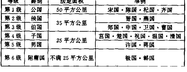 国王高高在上,当然最为尊贵。其次是贵族,包括诸侯(封国君主)、卿(政府最高级官员)、大夫(政府次高级官员)、士(武官)。再其次是平民,即自由民,被称为“庶人”。最低一级是奴隶,即商王朝遗民跟其他被征服的部落或俘虏。 任何国家的奴隶都是悲惨的,中国的奴隶亦然。他们是人类中最不像人类的动物,身体和生命都没有保障。阶层间的界限,不但是绝对的,也是庄严的,不允许逾越。这是周王朝从商王朝继承下来的事物之一,周政府除了用法律控制这种形态外,还特别制作礼教——若干世纪后,又称为名教,用教育的方法,以分别贵贱,使贵族永远是贵族,平民永远是平民、奴隶永远是奴隶。使奴隶们以及平民们了解,如果不安份守己,企图逾越已定的界限,不但违犯了法律,要受严厉的制裁;同时也违反了礼教,要被人所不齿。 在这种社会基础上,周王朝创立了它的封建政治制度。 封建政治制度的形态是,由元首分封贵族到各地建立封国,统治平民和镇压奴隶。周王朝的国王先以首都镐京(陕西西安西)为中心,沿着渭水下游和黄河中游划出一块广大的土地,称为“王畿”,由国王直接统治。而把王畿以外的所有土地,全部分封。封国的面积很小,二十个或三十个封国联合在一起,也没有王畿大,所以中央政府对封国可以完全控制。诸封国像群星捧月一样,环绕拱卫着王畿。封国君主对封国内的平民奴隶,具有绝对的权力、对国王则每年到首都觐见(入朝),用进贡代替赋税。当中央政府征兵从事战争时,封国君主有率领部队,听候调遣的义务。 封国君主,绝大多数是国王的亲属,第一任国王姬发征服了商王朝后,迫不及待地就大肆分封起来,凡是姓姬的亲族,只要不是疯子和白痴,每人都分到一块土地和一群奴隶,如姬昌的儿子姬爽,封到燕国(河南郾城,后迁至北京)。少数是建立功勋的官员,如周兵团总司令姜子牙,封到齐国(河南南阳西,后迁至山东淄博东)。第三类是由于政治上的原因,对不能征服或不能消灭的部落,就封他们酋长一个不费一文钱的爵位,安抚他不要捣乱,如夏王朝的后裔封为杞国(河南杞县),姬轩辕的后裔封为黄国(河南潢川),伊祁放勋的后裔封为唐国(山西翼城),姚重华的后裔封为陈国(河南淮阳)。 从此,部落一词逐渐消失,都变成了封国。但我们必须记住,在前十二世纪周王朝初期,封国跟部落没有区别,一个简陋的土屋土墙的小院子,就是封国君主的皇宫。 封国的地位平等,直属于中央,谁也管不了谁。但封国的面积并不一样大小,国君的爵位也有高低。爵位,是周王朝新生事物之一,共分为五级:“公”、“侯”、“伯”、“子”、“男”。当时总称所有的封国君主为诸侯,即很多侯爵之意,大概封侯爵的人特别多的缘故。五级之下,又有第六级“附庸”,附庸的土地更小,不属于中央政府,而属于附近较大的封国。我们用下表说明这种形势: