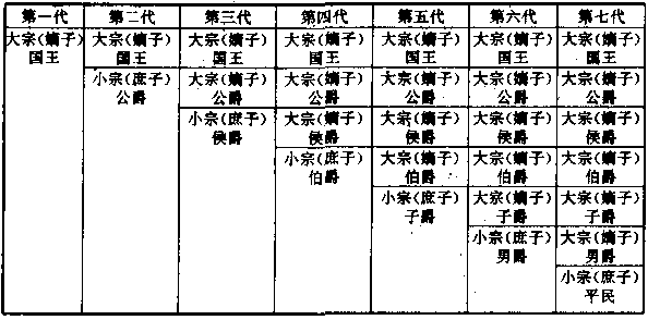 诸子的“嫡”、“庶”既然分明,宗法制度规定:只有嫡长子才是唯一有权继承国王或爵位的人。庶子即令比嫡长子年龄大,比嫡长子有才能,都不能继承。嫡长子即令是一个白痴或神经病,宝座也只有他的屁股才能坐。这个继承法案,可归纳为两句话:“传嫡不传庶,传长不传贤。”假使嫡长子死亡,则由嫡长子的嫡长子(即嫡长孙)继承。所有庶子固然不能问津,即令同母的胞弟嫡次子也不能问津,除非嫡长子无后。 嫡长子继承之后,庶子并不是全被逐出家门。他们仅只不能坐到金銮殿上称孤道寡而已,但他们可以得到次于宝座的爵位。在术语上,嫡子是“大宗”,庶子是“小宗”。再用下表显示它们的全部关系位置: