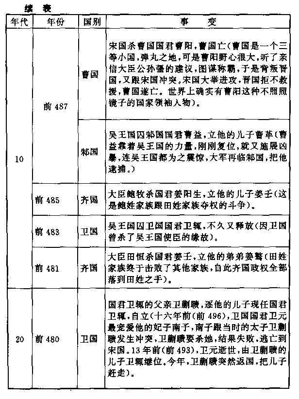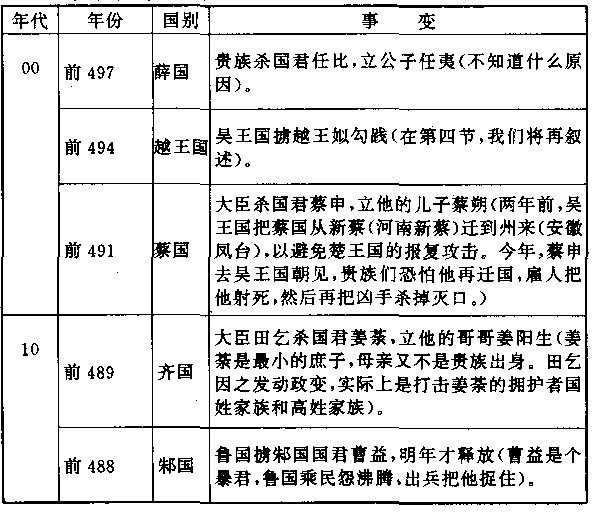 中国第一个黄金时代——大黄金时代,于本世纪来临,直到纪元前一世纪(那时,中国从分裂纷乱中终于凝结成一个庞大的国家,奠定中国的基本疆土,更奠定中华人的一项伟大的传统价值——大一统的心理基础)。在学术思想上,大黄金时代是中国最光荣、最长期的百花怒放、百家争鸣时代。这项灿烂的景观,要到两千三百年后的二十世纪初叶,才再重现。所以大黄金时代的学术思想,在文化史上具有空前的重要地位。 春秋时代于本世纪一十年代结束,吴王国亡于暴发户的越王国,五霸遂成为历史上的陈迹。一个新型的为时二百六十年的战国时代揭幕,越王国在消灭了强大的吴王国后,即从重要的国际舞台上若隐若现。久困于内部纷争的晋国,最后也被三大家族瓜分为三个独立封国。 国际权力开始以一种前所未有的姿态出现,即战争更多,战争的规模更大,引起社会结构的变动更巨。 本世纪(前五)跟上两个世纪一样,大国继续疯狂地并吞小国,强邻继续疯狂地并吞弱邻,国君被逐被杀的事件,继续疯狂地不断发生。 并吞的记录: 一、楚王国并吞顿国(河南项城)、胡国(安徽阜阳,不是纪元前八世纪被岳父灭掉的那个胡国)、陈国(河南淮阳)、蔡国(安徽凤台)、杞国(山东安丘)、莒国(山东莒县)、密国(河南新密)。 二、吴王国并吞越王国(浙江诸暨,不久复国)。 三、宋国并吞曹国(山东定陶)。 四、晋国并吞泫国(山西高平)、代国(河北蔚县)、仇由国(山西孟县)。 五、越王国并吞吴王国(江苏苏州)、郯国(山东郯城)。 六、秦国并吞密国(甘肃灵台)。 逐君杀君的记录: