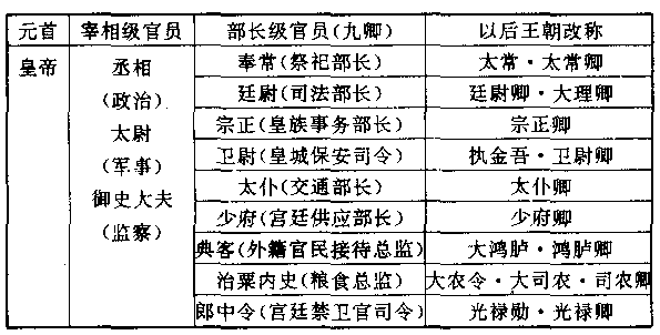 (秦郡有三十六郡说,有四十一郡说,有四十六郡说,四十六郡说为较新的研究。还未被学界普遍接受。此书作四十一郡,但郡非同时设。前二二一年初平六国时分为三十六郡。三十六郡为内史、三川、河东、南阳、南、九江、郭、会稽、颍川、砀、泗水、薛东、琅邪、齐、上谷、渔阳、右北平、辽西、辽东、代、巨鹿、邯郸、上党、太原、云中、九原、雁门、上、陇西、北地、汉中、巴、蜀、黔中、长沙。数年后即前二一四年又增桂林、南海、象郡三郡。又有广阳郡设于前二二三年、闽中郡设前二二○年。——编者) 这是一个划时代的突破和最骇人听闻的政治结构,没有封国封爵,没有公侯伯子男。当时没有一个人敢于想像皇帝的儿子们竟会跟平民一样,竟没有拥有土地,更没有拥有奴隶群。尤其是崇古的儒家学派的学者,面对着这么大的巨变,大惑不解,而且不久就大起恐慌,这简直是敲碎他们的饭碗了。 赢政大帝的生命是多采多姿的,充分显示他强力的独立人格和独立思考。他面对的是包罗万象的庞大帝国,充满陌生的人民。 然而,大黄金时代的光芒正在普照。大黄金时代最主要的特征之一是,一种只向前看的心理状态,人们逐渐地从周王朝那种崇古守旧的传统中脱颖而出,而以坚决的态度,发挥创造未来的倔强精神。赢政大帝正是这种主流思潮的代表人物,他是中国最勤劳的帝王之一,不分昼夜地为他的帝国服务。 在政府组织上,赢政大帝给中国历代王朝奠定了权威性的规范,使得以后几百个帝王只能在他所想到的圈子里作小小的修正,而无力作巨大改变。秦政府跟周政府大大的不同,周政府不过是一个国王亲属和大部落酋长们住的大庭院,秦政府则是真正的中央集权的政治机构。在皇帝之下设立宰相,宰相之下设立九卿——九位部长级官员。我们用下表说明: