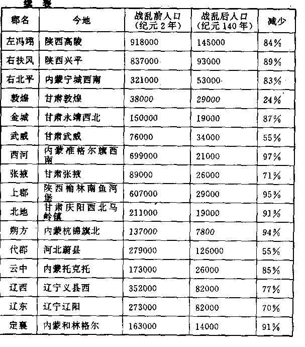 上表所列,仅是前十年崛起的人物。后十年中继续崛起的,还有被称为“铜马贼”、“五校贼’等数个变民集团,每个集团都集结兵力达十万百万人之多。全国处处是变民集团建立起来的营垒和政权,像王歆占据下邦(陕西渭南),蒋震占据霸陵(陕西西安东)。刘永死后,他的儿子刘纤继位梁王。魄嚣死后,他的儿子隗纯继位称王。 中国国土上,一片混战。 中国历代民变,性质上可分为五类。第一类是官逼民反的抗暴群众,像吕母、邓奉。吕母的儿子被海曲县长诬陷,死于冤狱,她就散去家产,结交壮士,攻杀海曲县长,然后乘船入海,成为“海盗”。邓奉本是刘秀的部将,但当他请假回乡,发现刘秀的军队奸淫烧杀的罪恶暴行时,他号召人民反抗。第二类是饥饿的群众,像绿林兵王匡,政府不能照顾他们,他们只好自己照顾自己。他们逃亡到比较容易活下去的地方,集结起来抢劫富人的粮食财物。饥馑在中国历史上占重要地位,它是大动乱大革命的原动力。第三类是自卫性的联合,县城和村落,为避免刘秀军队之类的奸淫烧杀,往往联合起来,武装自卫,当力量够大的时候,或对抗政府的政令,如魄嚣;或作为与政府合作的资本,如窦融。第四类是既得利益者的反击,像刘望、刘永、刘玄,本来是西汉王朝刘姓皇族,因新政府的兴起而降为平民,他们连做梦都在盼望摧毁现状,恢复过去的权势。第五类是野心家,大野心家如公孙述、刘秀,想当皇帝。小野心家如力子都、爱曾,只求在一方面称霸过瘾。 只有政治家才会正确的处理民变问题,王莽不会。他迷信警察和军队的力量,认为只靠监狱和屠杀,就可以根绝叛乱。结果是民变更多更烈。纪元二三年,以刘玄为首的变民集团,攻陷固若金汤的常安(新王朝把长安改称常安)。王莽被杀,新王朝覆亡,政权只维持了十五年。一场本可以歌颂的社会改革,化成一个悲剧,在流血中收场。 王莽死后,全国各地震慑于刘玄的皇帝血统和击杀王莽的威望,一致拥戴他当中国皇帝。这是一件千年难逢的奇迹,紊乱一团糟的庞大帝国,霎时间恢复秩序。可惜刘玄所建的汉政府,由一群无知无识的人物组成。三个月之前他们还在荒野中大喝小叫,三个月之后忽然成为国家领导人,他们还没有被训练出领导能力。于是,各地民变再度蜂起。这一个奇迹政权,从纪元后二三年到二五年,勉强支持三年。号称“赤眉”的变民领袖刘盆子(他们把眉毛涂成红色,以区别敌我),攻陷长安,刘玄被杀。 混战结果,变民首领之一的刘秀取得最后胜利。纪元后二五年,他自称皇帝;用武力把其他变民集团,一一消灭,再度使中国归于一统,建都洛阳(河南洛阳)。他称他建立的王朝仍为汉王朝,跟刘玄一样,表示是覆亡的西汉王朝的中兴。但因为他建都洛阳,史学家却称它为东汉王朝,并追称刘邦建立的王朝为西汉王朝。 二十一年大混战于纪元三七年结束,但给中国带来的伤害,却不易恢复。我们将几个重要地区战前战后人口减少情形,列表作一比较,即可看出这场灾难的严重程度。