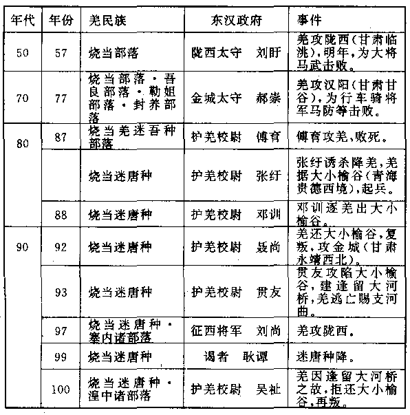 明年(七四),中国大将窦固进攻车师,前王国(交河城·新疆吐鲁番)跟后王国(务涂谷·新疆吉木萨尔),先后投降。这时中国才正式派遣陈睦担任西域总督(都护),驻扎乌垒王国(新疆轮台东北)故总督府所在地。北匈奴汗国对中国一连串的成功,十分愤怒,明年(七五),它大举反攻,两次进击位于车师的中国屯垦区,都没有获得决定性胜利。但它的同盟焉耆王国(新疆焉耆)、尉犁王国(新疆博湖)和龟兹王国,却突袭总督府,把陈睦杀掉,中国驻在车师王国的屯垦兵团,不得不全部撤退。这时中国新皇帝刘囗即位,对西域的惨重挫败,感到沮丧,就改变政策。明年(七六),下令放弃西域(新疆),撤销总督,召还所有中国使节和所有协防军队。 驻在遥远的疏勒王国的班超,也在召还之列。他临走时,疏勒全国恐慌,大将黎囗说:“中国遗弃我们而去,我们必再沦为龟兹的奴隶。”竟行自杀。班超勉强走到于阗王国,国王以下痛哭失声,抱住马腿不放:“我们依靠中国,跟婴儿依靠父母一样,使节绝不可走。”于是班超决定抗命留下,再返疏勒王国。可是仅只数天工夫,疏勒边境已有两个城市投降龟兹。班超急行攻击,杀六百余人,才把两城收回。中国东汉政府允许班超留下,并于不久后把他擢升为西域(新疆)总督。 在班超领导下,各国陆续归眼。九四年,他征调各国军队,向北道发动总攻,生擒焉耆王和尉犁王,带到陈睦驻扎的乌垒王国总督府故地死难之处,斩首致祭。距陈睦之死,整整二十年。——另一位凶手龟兹王,很幸运的早已病死。 最后,纪元后九七年,班超派遣他的一位部将甘英出使罗马帝国(大秦)。甘英是个懦夫,他向西进发,不知道到了什么地方,即行折回。他说他曾经抵达一个大海边上,船夫告诉他:“遇到顺风,三个月可到。遇到逆风,可能要航行两年。旅客至少需要带三年粮食。而且茫茫大海之中,最使人思念故乡,很多人中途死亡。” ——有人说甘英所到的地方是波斯湾,但波斯湾即令有再大的顺风,三个月也到不了罗马。所以该地方可能是巴勒斯坦,果真如此,那就证明首英的报告不可靠。他到巴勒斯坦之时,正是基督教使徒圣保罗向罗马出发之时。巴勒斯坦和罗马之间,交通频繁。甘英不应该躲在旅馆里只听船夫一面之词,连码头都不去一下。否则码头上的繁荣忙碌,会证明往返便利。班超显然选错了人,如果是班超本人,或另一位部将田虑,说不定当时世界上东西两大帝国,从此直接接触。文化的交流,用不着再等漫长的一千七百年之后的十八世纪。 当中国把匈奴汗国终于征服,又在西域(新疆)恢复主权的时候,散居中国西部边界内外的羌民族各部落,于本世纪(一)中叶之后,却跟东汉政府之间,爆发战争。 羌民族与汉民族是两个血统和两种文化的民族。羌民族以游牧为主,跟匈奴民族非常接近,跟务农的汉民族在生活方式上格格不入。但羌民族比匈奴民族落后,分为千百以上的大小部落,散布在黄河上游和渭水上游。从来不知道互相团结,只知道互相仇杀,所以始终不能集结像匈奴那样”大的力量,更谈不到建立国家组织。 纪元前二世纪八十年代时,中国向西南夷开拓疆土,在白马国(甘肃西和)设立武都郡。又在匈奴汗国河西走廊故地上设立敦煌、酒泉、张掖、武威四郡。于是产生两种情况:一、中国势力像一把利刃一样插在匈奴汗国和羌民族之间,把他们隔开,使羌民族无法得到匈奴的援助。二、汉民族在政治军事保护之下,积极向西移殖,把羌民族逐出故地。除少数部落外,大多数部落先后西迁,迁到青海湖以西或以南地区。 纪元前一世纪初叶,羌民族中最大的部落之一先零部落从青海湖向东向北发展,进入中国边界,越过惶水。到三十年代,曾对中国作过大规模的突击,幸好当时的大将赵充国坚决反对高压,改用怀柔政策,在边界地带实行屯垦,战争才告平息。百余年以来,羌汉两民族相安无事。然而,与日俱增的官员们的贪暴,汉民族与羌民族纠纷中,官员因接受贿赂的缘故,总是对汉民族偏袒。羌民族愤怒的发现,除非把地方政府官员杀尽,他们将永不能平安。于是,抗暴行动不可避免。 本世纪(一)五十年代,第一次抗暴爆发,接连着一次又一次,一片血腥。重要战斗事件,有如下表: