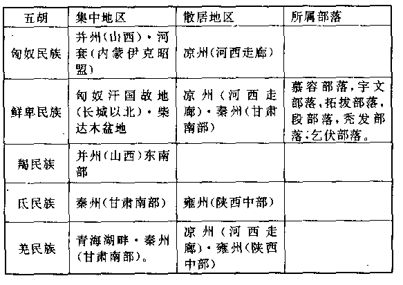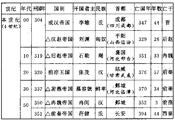 五胡深入中国,并不是由于他们的侵略,而是大多数出自中国的邀请,甚至强迫、像匈奴民族,于纪元一世纪投降中国后,中国就把他们内迁到西河美稷(内蒙准格尔旗),经过三百余年,人口增加,居留地相对扩大。像羌民族、氐民族,当上世纪(三)三国时代中国人口过度缺少时,曾不止一次的强迫他们内迁屯垦,以增加财富兵源。他们的面貌跟汉民族不一样,胡须较多而眼睛下凹,使用汉民族听不懂的言语。上世纪(三)末叶,鲜卑民族酋长秃发材机能,氐民族酋长齐万年,先后在秦州(甘肃南部)发动过两次强烈的民变,因之引起人们对五胡喧宾夺主情势的注意。其中一位中级官员(太子洗马)江统,作《徒戎论》(戎,即胡),主张把五胡全部迁出中国。这当然无法办到,把数百万人从他们世代相传已被认为是自己的肥沃土地上赶走,赶到举目荒凉的塞外,即令强大十倍的政府,也不敢尝试。 促使五胡叛变的不是民族意识,而是晋政府的腐败和官员的贪污残暴(在叙述一世纪羌战时,我们曾对此特别强调人像普县大屠杀的主角石勒,他的遭遇就是一个最典型的说明。石勒是羯人,家庭穷苦,自幼丧父,跟母亲相依为命,在故乡武乡(山西武乡),出卖劳力,为人做苦工,维持母子不致饿死。他不识字,因为穷苦而又卑贱,所以连姓都没有,只有乳名,在人海中,不过一个可怜的小小泡沫。八王之乱和连续旱灾,使晋政府各地驻防的军队粮饷,无以为继,并州(山西)州长(刺史)司马腾亲王为了筹措粮饷,竟想出使人难以置信的卑鄙手段,他大规模逮捕胡人,贩卖奴隶。无数善良守法的穷苦青年从他家人身边和工作场所,被官员捕去,两人共戴一枷(枷,酷刑刑具之一,在木板当中凿洞,套到颈上),徒步越过海拔高达二千米的太行山,走向五百公里外的山东(太行山以东)奴隶市场,向大商人、大地主兜售。石勒有几次都差些病死在路上,但押解人员不愿猪仔减少,才几次免于死亡。石勒从他母亲身旁被捕去时,只二十一岁,干年以后我们仿佛仍可听到那衣不蔽体的老妇人绝望的哭声,她没有地方申诉,因为犯罪的就是合法的政府。石勒最初被卖给一个大地主为奴,后来,他乘机逃亡,投奔附近一个农民暴动集团,集团的领袖汲桑,才给他起一个姓名——石勒。不久,石勒自己集结了一支军队,汉赵帝国封他为将军,命他在中原一带游击,他的高度才能和晋政府官员日益的贪污凶暴,使他的军队像滚雪球般越滚越多。 石勒的遭遇,充分的显示症结所在。即令把五胡全部迁到塞外,汉民族也会起而抗暴,事实上汉民族已经纷纷起而抗暴了,汲桑就是其中之一。 五胡十九国立国时间都很短促,最短的只有三年,最长的也不过五十七年。而且并不全由五胡建立,也有汉人插足其间。忽兴忽亡,错综复杂。我们为它们列出一表,以便先有一个轮廓印象。表中加△记号的,指最重要的数国。 五胡十九国表: