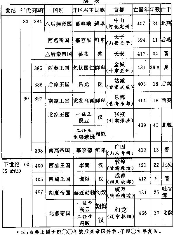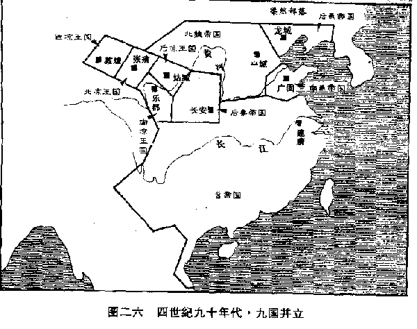 明年(三八五),前秦帝国瓦解的速度加快。西燕帝国在战败苻睿后,改变主意,暂时放弃东归的念头,进围长安。关中(陕西中部)氐民族既然大量迁出,苻坚不能再集结更多的武装部队,只好留他的儿子镇守长安,他自己突围向西,计划到南安(甘肃陇西)一带氐民族老根据地,动员兵力,再回来解救长安。可是大饥馑使长安不能固守,他一离城,就告陷落。苻坚西行到五将山(陕西岐山北),被后秦帝国的巡逻部队截获,送到新平(陕西彬县)石佛寺。姚苌向苻坚索取皇帝传国玉玺,苻坚大骂他忘恩负义,姚苌就把他缢死。姚苌于二十年前在绑赴刑场处斩时,被当时还是亲王的行坚救下来。所以连后秦的羌人部队,都为这一代伟人的悲剧,流下眼泪。 苻坚死后,他的儿子苻丕在晋阳(山西太原)继位,但前秦帝国已走到尽头。居住苑川(甘肃榆中)另一支鲜卑民族的一位酋长乞伏国仁,在勇士堡(甘肃榆中)独立,建西秦王国。又明年(三八六),淝水战役前夕,苻坚派往征服西域(新疆)的氐民族大将吕光于征服西域后胜利归来,走到姑臧(甘肃武威),听到苻坚死亡的消息,归途又被新兴起的西秦王国遮断,于是他就在姑臧当起王来,建立后凉王国。 同年(三八六),五胡十九国之外的另一国——由漠北鲜卑酋长拓拔珪建立的代王国(稍后改称魏帝国、史家称为北魏),在遥远的塞外盛乐(内蒙古和林格尔)悄悄崛起,它是一个微不足道的简陋政权,臣服后燕。但它不属于五胡的十九国,因为它的寿命比任何一国都长,长达一百七十一年,在大分裂时代后期的南北朝时代,担任主要角色。 ——本世纪(四)八十年代,中国境内八国并立:前秦帝国后燕帝国、西燕帝国、后秦帝国、西秦帝国、后凉帝国、北魏帝国、晋帝国。 前秦帝国瓦解,北中国一片混战,兵燹和大饥馑,纵横千里,都是枯骨。人与人之间互相残杀,煮食对方的尸体——这种悲惨的命运在中国历史上太多太多了。 三九四年,前秦帝国挣扎到最后一任皇帝苻崇,被西秦王国所灭,建国四十四年。同年,放弃长安,东进到长子(山西长子)建都的西燕帝国也被后燕帝国所灭,建国十一年。然而,三年之后(三九七),从后凉王国又分裂出两个王国:鲜卑民族的南凉和匈奴民族的北凉。中国境内,仍八国并立。 北魏帝国在塞北悄悄崛起,是一件当时没有人看到眼里的大事。它向后燕帝国进贡,以求得到保护。后燕帝国最初也确实尽到了宗主国的责任。可是后燕的开国皇帝慕容垂年纪日老,跟外界的接触也日少,由他那花花大少型的皇太子慕容宝掌握大权。三九一年,北魏帝国开国君主拓拔珪派他的弟弟拓拔觚,到后燕首都中山(河北定州)朝觐,慕客宝向他索取良马,拓拔珪拒绝。慕容宝就把拓拔觚扣留不放(这使我们想到纪元前六世纪九十年代楚王国宰相囗囊瓦)。两国关系,自此破裂。慕容宝对蕞尔小国的北魏竟不肯屈服,觉得大丧面子,他用种种方法在老爹面前挑拨,到了三九五年,已经昏聩了的慕容垂终于被激怒,命慕容宝率领九万精兵,讨伐拓拔珪。拓拔珪采取坚壁清野战略,慕容宝长驱直入,行军四百余公里,如入无人之境,一直抵达黄河北岸,不见敌踪。但与首都中山的联络,却被拓拔珪的奇兵切断,得不到后方消息。拓拔珪又教人散布谣言说,本已患病的慕容垂,已经死亡。慕容宝疑惧不安,最后只好撤退。退到参合陂(山西阳高)时,拓拔珪的大军追及,合围总攻,后燕兵围崩溃,一半战死,一半投降。拓拔珪对太多的降卒感到恐惧,于是纪元前三世纪长平关战役惨剧重演,降卒全被坑杀。仅慕容宝和幸运的数千人逃回。