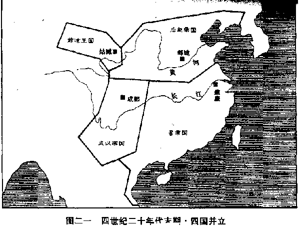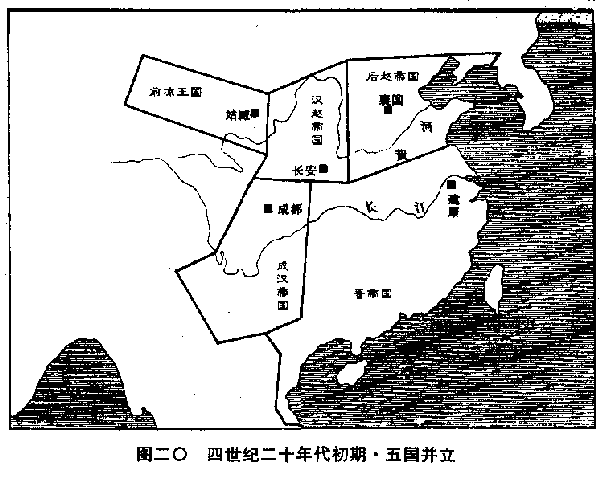 依照上表所列,我们顺序叙述。 五胡十九国中,最先建立的是成汉帝国。略阳(甘肃秦安)是氐民族集中地之一。上世纪(三)末,北中国大饥馑,千里枯槁,饿浮满道,略阳氏人扶老携幼,向南逃生。辗转进入益州(四川),分散各郡县,或给人做佣工,或经营小本生意。本世纪(四)第二年(三○一),乱的一团糟的晋政府忽然下令,要流亡各地的难民,全部遣返故乡。益州州长(刺史)罗尚,既昏又贪,认为发财的机会来了。一面严令氏人在限期内离境,一面设立关卡,把氏人所携带辛辛苦苦积蓄的一点财物,全部没收。愤怒的氏人这时得到八王之乱继续扩大,故乡仍然饥馑的消息,于是他们面临选择:一是回到略阳饿死,一是留下来被晋政府杀死,一是叛变。他们选择了叛变,推举酋长之一的李特为领袖,武装起来,向罗尚进攻。李特不久战死,他的儿子李雄在三○三年攻陷成都,罗尚逃走。三○四年,李雄在成都宣布建立成汉帝国。 但是,给晋政府致命创伤的不是远在西南边陲的成汉帝国,而是继起的另一个变民集团所建立的汉赵帝国。这我们要追溯到匈奴汗国最后一任君主呼厨泉单于,上世纪(三)二一六年,呼厨泉单于赴邺城(河北临漳)晋见当时宰相曹操时,曹操把他留下,划分匈奴汗国为五部,每部设一个都督,匈奴汗国从此灭亡。百余年来,匈奴人跟汉人杂居通婚,绝大多数已经汉化。以单于为首的贵族阶级,本姓栾提,现在自称是汉王朝公主的后裔,所以改姓为刘。本世纪(四)初,一位左贤王的孙儿刘渊出现,镇守邺城的皇太弟司马颖任命他当匈奴五部大都督,也就是实质上的单于。但他跟其他匈奴的高级贵族一样,限制居留在邺城,不能离开。三○四年,当蓟城(北京)将领王浚勤王,率兵南下时,刘渊乘机向司马颖建议说:“王浚鲜卑兵团有十余万人,邺城部队恐怕不能抵抗。我愿为你效劳,动员匈奴五部兵力,共赴国难。”司马颖大喜,放他回去。刘渊回到左国城(山西离石北),立即集结五万余人。但司马颖已经崩溃,南奔洛阳。刘渊叹息说:“司马颖真是一个奴才。”遂即宣布独立,建立汉赵帝国。