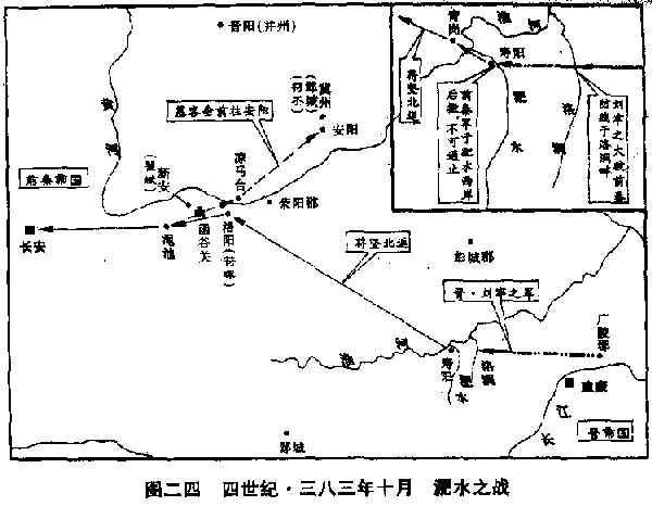 苻坚统一北中国后,下一个目标是统一全中国——这是任何分裂时代,每一位英雄豪杰都具有的愿望。三八三年,苻坚南征,命他的弟弟苻融率领步骑联合部队二十五万,担任先锋。苻坚亲率步兵六十万、骑兵二十七万的主力部队,随后续进,总共一百一十二万人。纵在一千六百年后的二十世纪来看,这也是一个雷霆万钧的数字。大军从长安出发,直指晋帝国边境重镇寿阳(安徽寿县)。 消息传到建康(江苏南京),像大地震一样,晋帝国大小官员一个个面无人色,宰相谢安更目瞪口呆,赖以抗敌救亡的大将谢石和先锋谢玄,总共只有兵力五万人。派遣紧急赴援寿阳的将领胡彬,也只有水军五千人。用这一小撮胆颤心惊的部队去抵御一百一十二万能征惯战的强敌,其结果比鸡蛋去碰石头,还要明显。人心惶恐,不可终日。谢安不是靠才干而是靠门第取得高位的,谢石是谢安的弟弟,谢玄是谢安的侄儿,政府大权,久在谢姓家族之手,皇帝司马昌明不过是个木偶。谢玄向谢安请示军机,谢安连他自己都不知道应该怎么办,只茫然说:“另外有命令。”在意料中的当然不会有什么另外命令。谢玄请人再去请示,谢安索性出城游山玩水,以躲避必须答复的压力,一直玩到深夜才回。远在上明(湖北松滋)的大将桓冲派遣三千精兵,入卫建康(江苏南京),谢安把他们遣回说:“首都已有准备。”其实首都根本没有准备,谢安也从没有找过任何人商量如何准备。像一只把头埋在沙堆里的鸵鸟,谢安只把头埋在宰相府里,不敢向现实张望。然而,他跟其他颟顸人物有一点不同,他有空前的好运气。 谢石、谢玄既然在最高当局那里,得不到什么指示,只好统军出发。将到淝水(东淝河),不敢再进。这时寿阳(安徽寿县)陷落的噩耗传来,军心沮丧。提前出发救援寿阳的胡彬水军,失去目标,向后撤退,而粮道又被切断,胡彬向总司令谢石告急:“敌人强劲,我军无食,此生恐难相见。”偏偏这个传令兵又被前秦兵团的巡逻队擒获,晋军虚实,完全暴露,可以说一切不幸都落到摇摇欲坠的晋帝国头上。前秦兵团先锋司令苻融看了胡彬的告急文件,向苻坚报告说:“晋军既弱又少,一击即破。我们必须迅速行动,才能一举把它的主力摧毁,免得逃脱。”苻坚这时才行军到距寿阳一百七十公里外的项城(河南沈丘),接到报告后,立即命大军随后急进,自己率领轻骑兵八千人,昼夜奔驰,赶到寿阳跟苻融相会。遂即派遣部长级官员朱序,向谢石招降。朱序原是晋帝国雍州(湖北襄樊)州长(刺史),被前秦帝国俘虏,他心中始终怀念故国。他秘密告诉谢石:“前秦如果百万大军集结完成,恐怕无法抵挡。但现在他们大军在后,寿阳城内,只二十余万人,你最好立即行动,如果能先击败先头部队,对他们士气是一个打击。然后再和大军决战,才有胜利希望。”谢石决定照朱序的话孤注一掷,向涌水挺进。前秦兵团在淝水北岸构筑工事,谢石派人告诉苻融:“你们领兵深入,当然为了求战,现在隔河相峙,好像作长久打算,岂不有失初意。请向后稍退,让我们渡河。”强敌当前,弱小的一方竟敢渡河,只有天绝其魄的人才选择此一死法。苻坚告诉苻融说:“等他半渡,我们用铁骑冲击,使他无一人生还。”于是,答应谢石的请求,下令退却。 ——纪元前七世纪城濮战役时,发生过“退避三舍”的故事。晋国军队在楚王国强大兵力之前,后撤四十五公里,营阵严整,楚军尾追不舍,始终无法突击。晋国君主姬重耳在高处下望,看见他的部队井然的秩序,感慨说:“这都是元帅谷阝榖的功劳,有军如此,任何敌人都能克服。” 现在一千零一十五年后,前秦帝国也敌前退军,而且是一种在绝对优势下诱敌深入的谋略退军。敌人既弱又少,还隔了一条使敌人不能立即发动攻击的淝水,理应十分安闲而从容不迫。可是前秦帝国却缺少一位谷阝榖,退却令下,前秦兵团向后移动,想不到这一移动就像山崩地裂,不可遏止。我们有理由相信,苻坚这个退却命令,是他直接向全军颁发的,所以全军同时行动,乱哄哄地变成排山倒海般狂奔,以致失去控制。谢石乘着敌人汹涌后退之际,毫无困难的渡过淝水,闪电般展开攻击。苻融亲自出马,绕着大军边沿掠阵,企图阻止他的军队后退,可是坐骑忽然栽倒,竟被乱兵践踏而死。朱序乘机在后高呼:“秦兵大败了。”前秦兵团本来是主动撤退的,到此竟一清而不可收拾,互相夺路,向北逃命。苻坚随着乱军逃走,几乎被流箭射死。 这是著名的淝水战役,其实并没有“战”,而只有“役”,前秦帝国不是战败,而是退败。我们固可事后在前秦帝国内部找出必败的原因,但在晋帝国内部,我们却找不出必胜的原因。我们只好相信即令是国家巨变,或在致千万人于死的战争中,都有命运的影响,至少晋帝国靠命运得以免去覆亡。一种不能预见,不可想像象冲击介入,产生的连锁反应,能使历史的巨轮停顿或转向。赤壁战役(二○八)使中国统一延缓七十年,淝水战役使中国统一延缓两个世纪。 对强大的前秦帝国而言,淝水战役仅是一次战场上的失败,更仅只是一次先头部队的失败,国家主力毫无损伤。依正常情况判断,苻坚可以立刻发动再一次攻击,再糟也不过跟赤壁战役之后的曹操一样,两国继续对峙。可是,前秦帝国包括的民族太复杂了,作为国家主干的氐民族,为数既少,而又分散四方。帝国像建立在沙滩上,淝水战役使它倾斜。以后一连串错误的适应,使它倒塌。 淝水战役的当年(三八