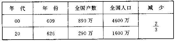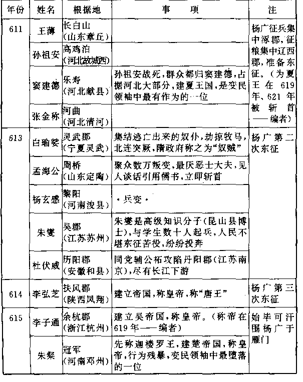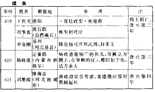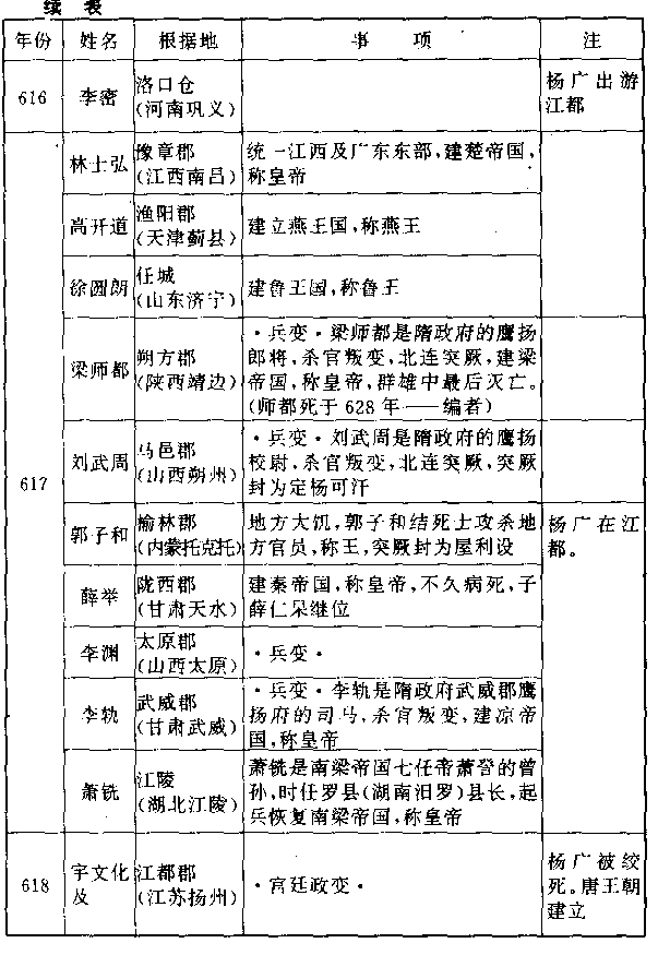 在宇文化及宫廷政变的前一年(六一七),镇守太原的大将李渊已先行叛变,起兵南下,攻陷长安(陕西西安),立杨广的孙儿杨侑当皇帝,遥尊杨广为太上皇。六一八年,字文化及把杨广绞死后,立杨广的侄儿杨浩继位,统军北返洛阳。但遍地都是武装的抗暴力量,这个禁卫军团每一步都受到攻击,已不可能到达目的地。字文化及看到大势已去,索性把杨浩杀掉,自己当皇帝。李渊在长安听到消息,也把杨相杀掉,自己也当皇帝。 杨广的另一个十五岁的孙儿杨侗,在洛阳即位,作隋王朝第五任皇帝,支持到明年(六一九),宰相王世充也把他杀掉,自己坐上宝座。隋王朝历时仅三十九年而亡。以隋王朝力量的雄厚,如果杨广只是中等暴君,帝国可能仍承受得住,不致如此迅速地覆没。但杨广太能干了,他在短短的十五年中,就灭掉这个强大无比的帝国。 十八年的大混战,最后的胜利属于李渊,他建立的唐王朝代替隋王朝,使中国于二十年代再行统一。比起从前“二十年”、“三十年”改朝换代混战,十八年是最短的痛苦,然而这最短的痛苦却中。使全国三分之二的人民死于非命。下列统计数字,可作说明: