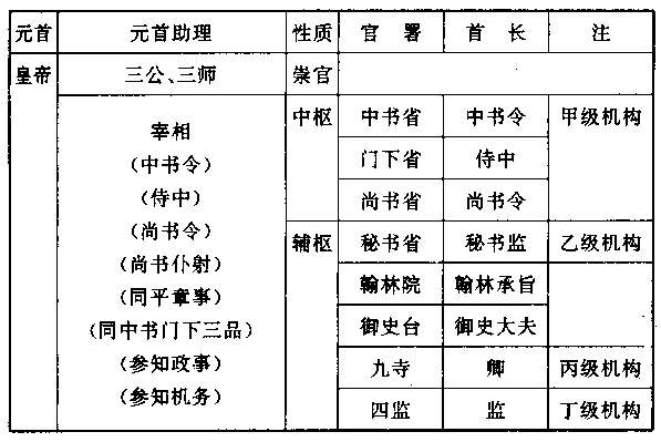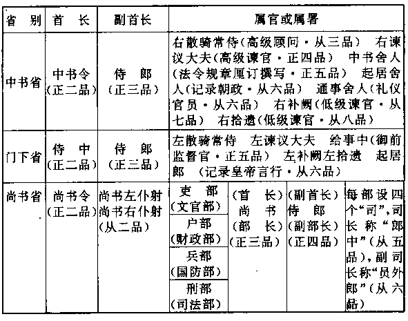所谓崇官,即现代所称的国家元老,一种只有尊荣而没有实际权力的最高顾问。“三公”、“三师”只是习惯称呼,事实上包括六种官位:太师、太傅、太保、太尉、司徒、司空。他们只支领俸禄,不干预国家政务。 乙级机构秘书省,二世纪中期,东汉政府设立秘书监官员,负责保管及校勘政府所持有的图书。三世纪初,三国时代之曹魏帝国政府,把秘书署扩大成为一个“省”,而命秘书监作为首长。唐政府仍维持它存在,类似国立图书馆,当然只供应帝王和高级官员阅读,不向人民开放。翰林院,是唐政府创立的类似文化人聚会所,或高级官员储备所的官署。唐王朝初建时,各地经学家(研究儒书五经的学者)、文章家(专门写宣言、文告,或短篇论文之类的知识分子)、预言家(星相占卜)、艺术家(包括画家、雕刻家),纷纷向首都长安集中。皇帝特别指定一个处所,招待他们之中最杰出的若干人士,以便随时召见。这个处所称翰林院,由年高德劭的一位担任首长,称翰林承旨,其他人士则称翰林学士。以后各色人等陆续淘汰,只剩下文章家,专为皇帝撰写诏书。因为汉字和文言文运用困难,一个人至少要有二十年以上的刻苦努力,才能胜任。文章家在这方面的特殊能力,很受到皇帝的重视。因之翰林学士往往比其他官员容易升迁到宰相地位,所以当时称翰林学士为“储备宰相”(内相),成为知识分子最羡慕的一种职位。御史台负责监察弹劾,首长御史大夫,副首长御史中丞,以及所属诸御史。他们是皇帝的耳目,但也不时反映民意。 丙级机构九寺,即九卿办公官署,从次要地位又再被挤到政府的角落,职务和权力都非昔比,大半被尚书省的六部所夺,唐王朝九卿的职掌跟秦王朝的职掌大不一样。一、太常寺,负责典礼布置跟宫廷医药。二、光禄寺,祭把用品跟宫廷饮食供应。三、卫尉寺,管理军械库。四、宗正寺,处理皇族事务,如继承封爵,保护坟陵之类。五、太仆寺,马匹牧养跟牧场管理。六、大理寺,最高法院。七、鸿鼐寺,藩属事务部。八、司农寺,农林部。九、太府寺,负责宫廷费用供应,也就是皇帝的私人钱库。 丁级机构四监是尚书省的附属机关,但它具有完全的独立性。一、国子监,隶属礼部,即国立京师大学,设六个学系:国子学系、太学系、四门学系、律学系、算学系、书学系,每学系有若干教授(博士)。二、将作监,隶属工部,负责政府重大土木建设工程。三、军器监,隶属兵部,就是兵工厂。四、都水监,也隶属工部,负责水利建设工程。 最后,我们叙述行政中枢,即甲级机构的“三省”;尚书、中书二省,是三世纪曹魏帝国的旧制,不过尚书省所属六部的权力,更为扩大,实质上已完全代替了九卿,他们的职掌在下表中已加说明。六世纪北魏帝国和南梁帝国时,又在这二省之外增加门下省——因它设在宫门之下而得名。于是中央政府遂成为三省,具有下列的编制: